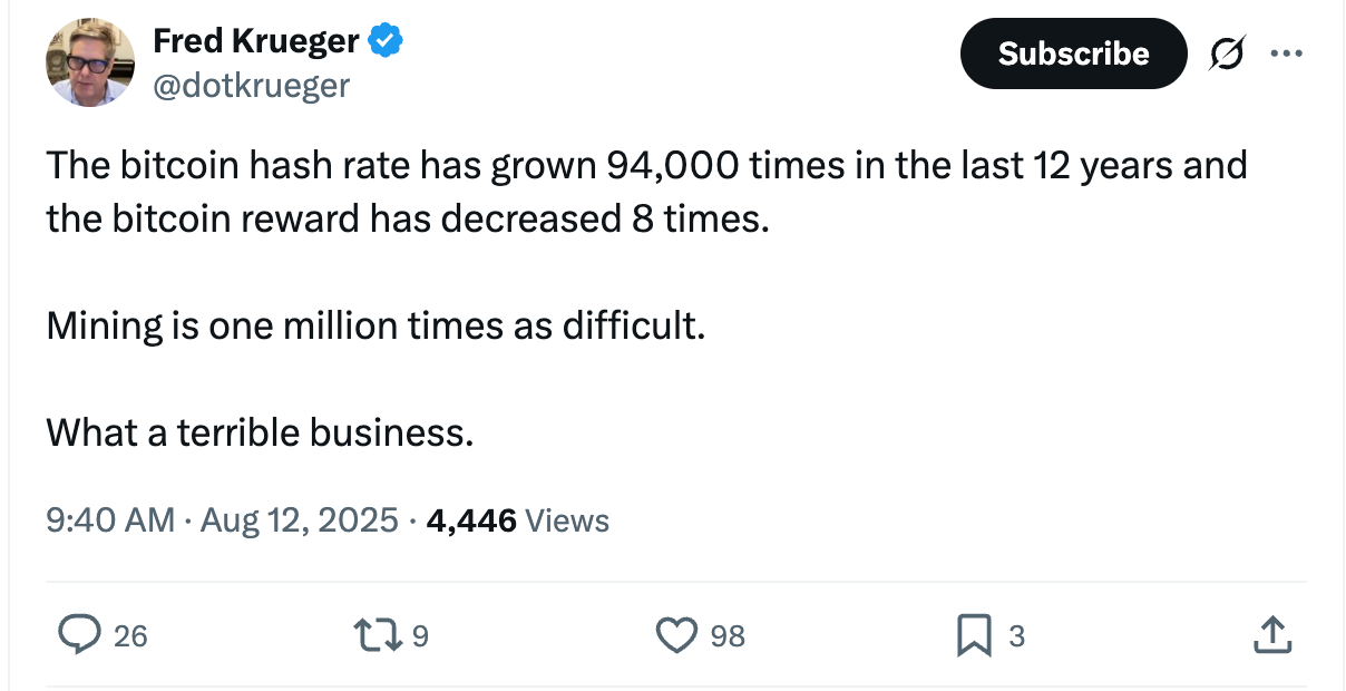 If Bitcoin used "almost no energy," it would also have almost no security budget. It would be cheap to attack, easy to censor, and pointless as a global settlement layer. Mining being a "terrible business" is a feature, not a bug. It keeps margins low, competition high, and capture expensive.