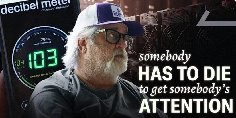 This episode featured the Browning family, 80-somethings living 70 miles outside Dallas, getting pounded by a constant low-frequency hum from tens of thousands of Bitcoin mining rigs. The video had everything: noise pollution with 24/7 ASIC hum allegedly hitting 100 dB inside homes, energy usage of 300 megawatts (enough to power Austin), water draw up to 1.5 million gallons a day at some sites, and the usual local politics where companies pay less for power than residents while politicians pocket mining PAC money.