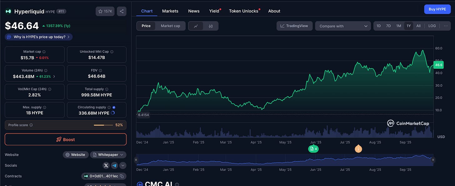 Its strengths are impressive. Ultra-low latency with gas fees under a penny. An on-chain order book with MEV protection. Over 100 crypto perps with deep liquidity. Its token, HYPE, powers governance, fee discounts, and yield, with a $15.8 billion market cap signaling investor confidence. Even as newer platforms gain ground, Hyperliquid still moves about $30 billion in daily volume with $500 million open interest.