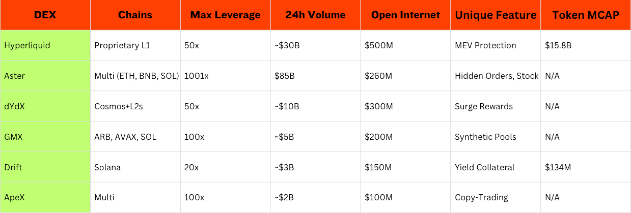 DEX Chains Max Leverage 24h Volume Open Interest Unique Feature Token MCAP Hyperliquid Proprietary L1 50x ~$30B $500M MEV Protection $15.8B Aster Multi (ETH, BNB, SOL) 1001x $85B $260M Hidden Orders, Stock Perps N/A dYdX Cosmos + L2s 50x ~$10B $300M Surge Rewards N/A GMX ARB, AVAX, SOL 100x ~$5B $200M Synthetic Pools N/A Drift Solana 20x ~$3B $150M Yield Collateral $134M ApeX Multi 100x ~$2B $100M Copy-Trading N/A